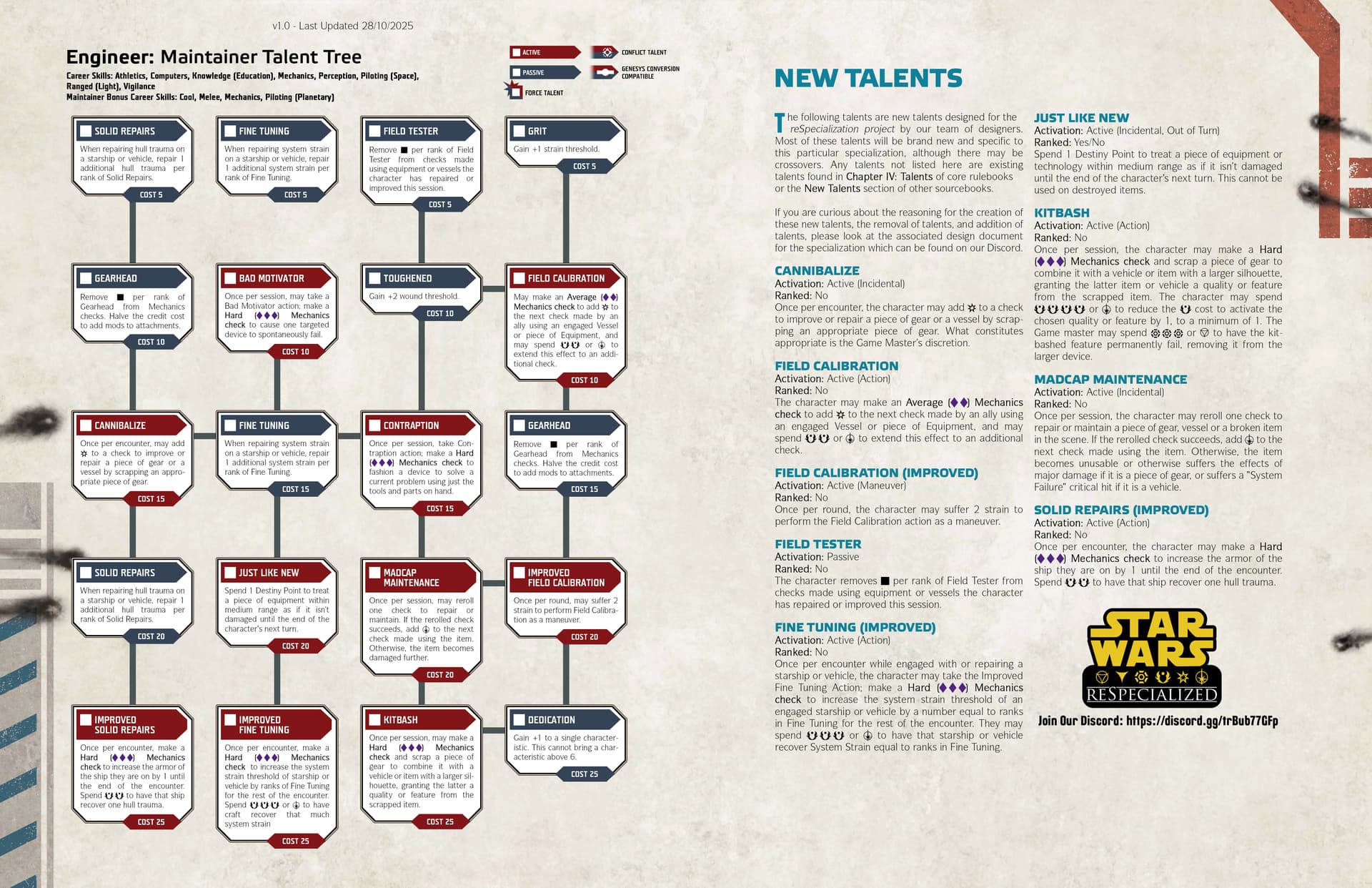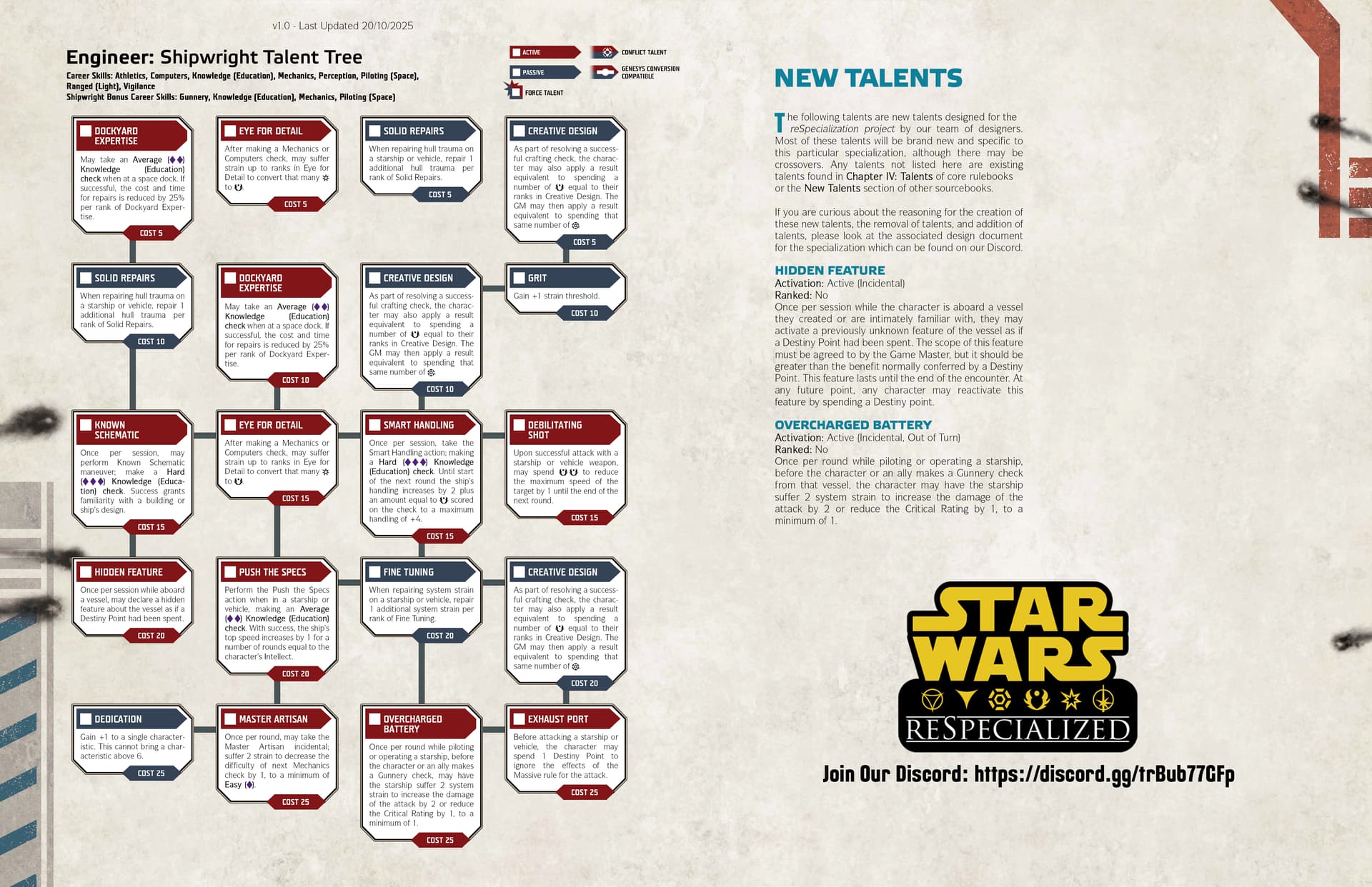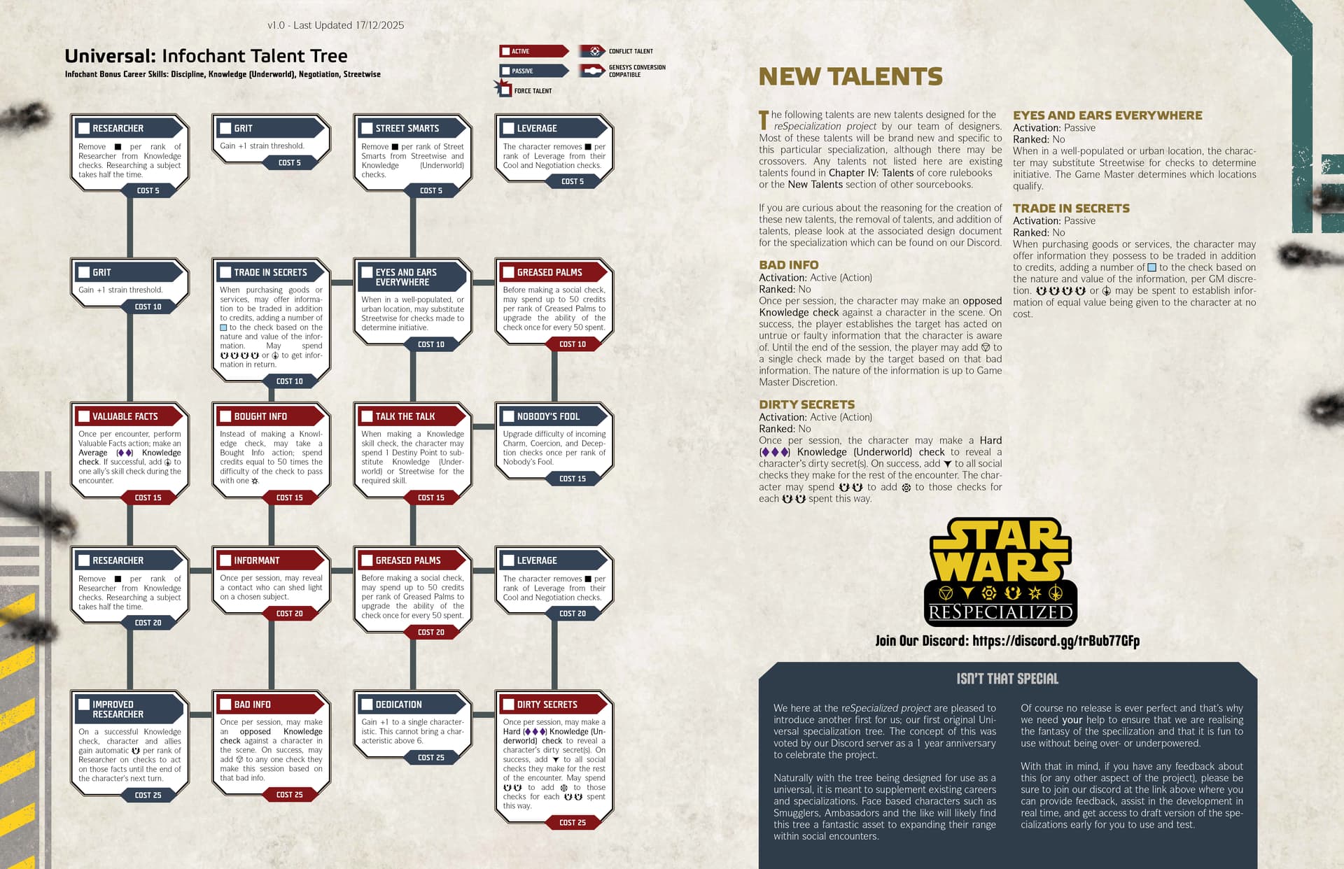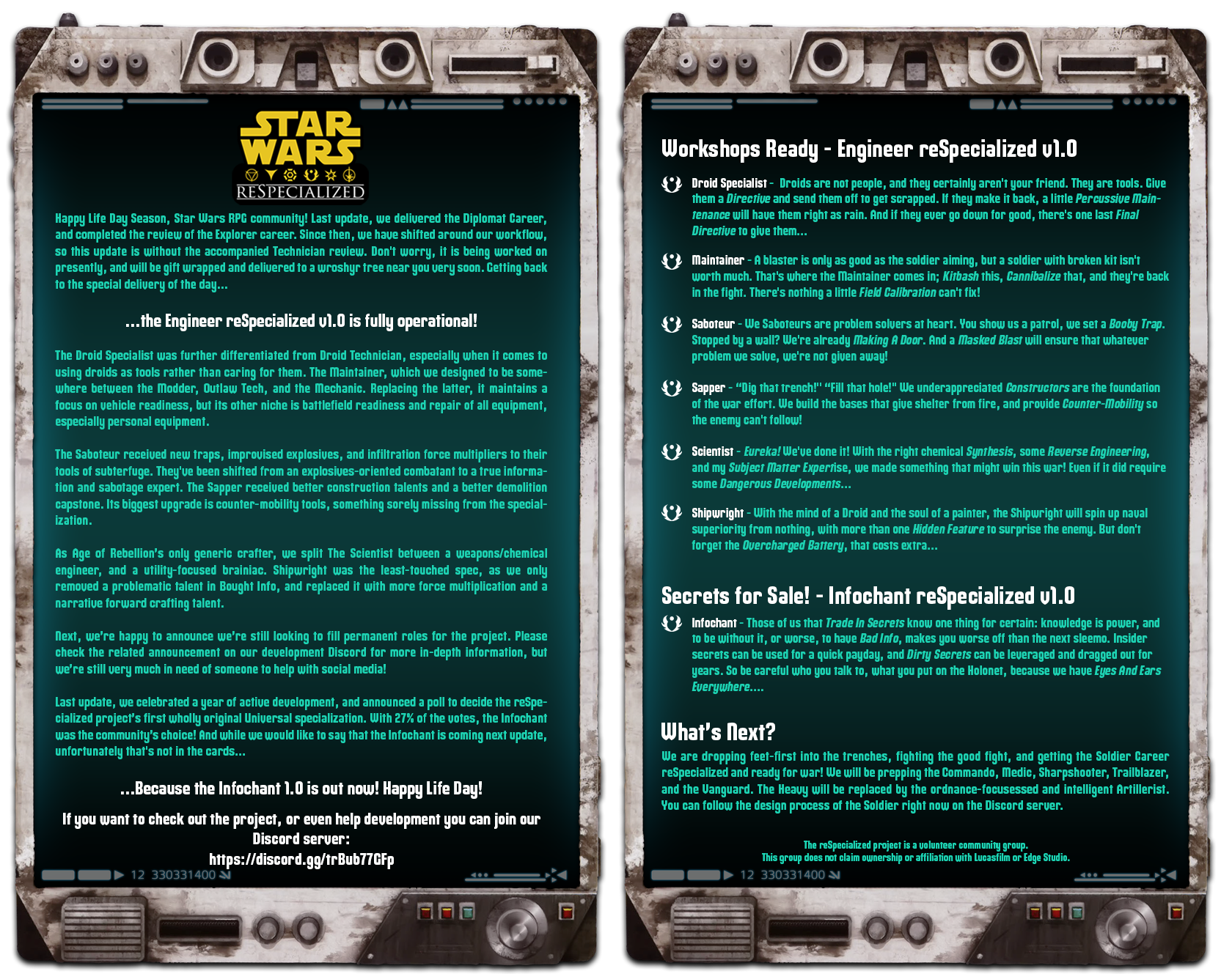 Last update, we announced a poll to decide what the reSpecialized Project’s first original universal specialization would be, and the Infochant won that vote. We are happy to announce that there’s an extra life day present under the tree this holiday season! We found the design of the Infochant to be relatively straightforward. It was designed intentionally as a universal specialization, our choices reflecting that it would be a complimentary archetype for a character with a baseline competency in some related niche. That is why we shied away from spycraft, slicing, and thievery. This tree leans heavily on buying, trading, and using information and secrets for fun and profit. We think it’s a ton of fun, are looking forward to making new specializations in the future.