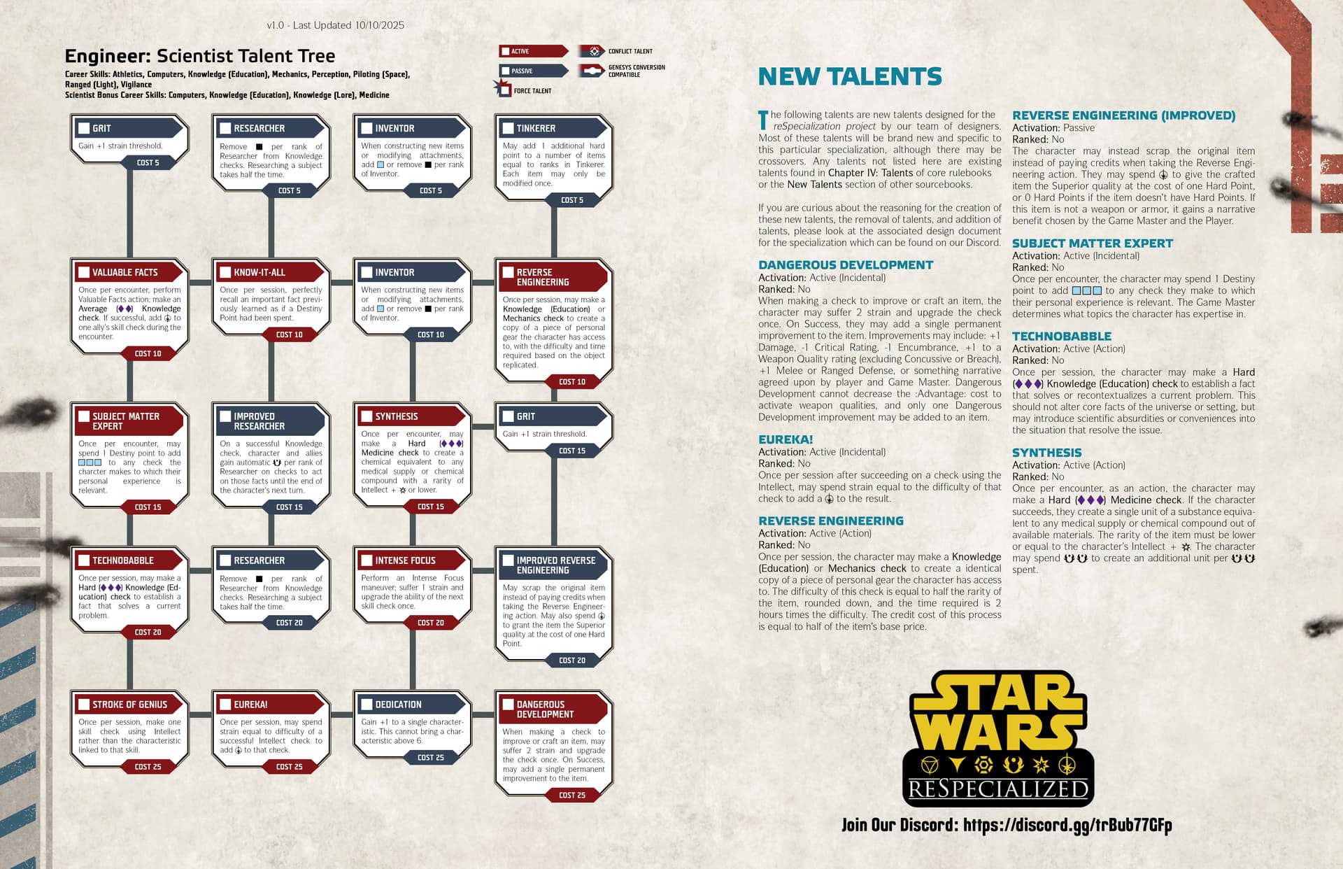 - The Scientist received a huge overhaul, giving it many more crafting-dedicated talents, to act as non-Force and Destiny’s Artisan.
