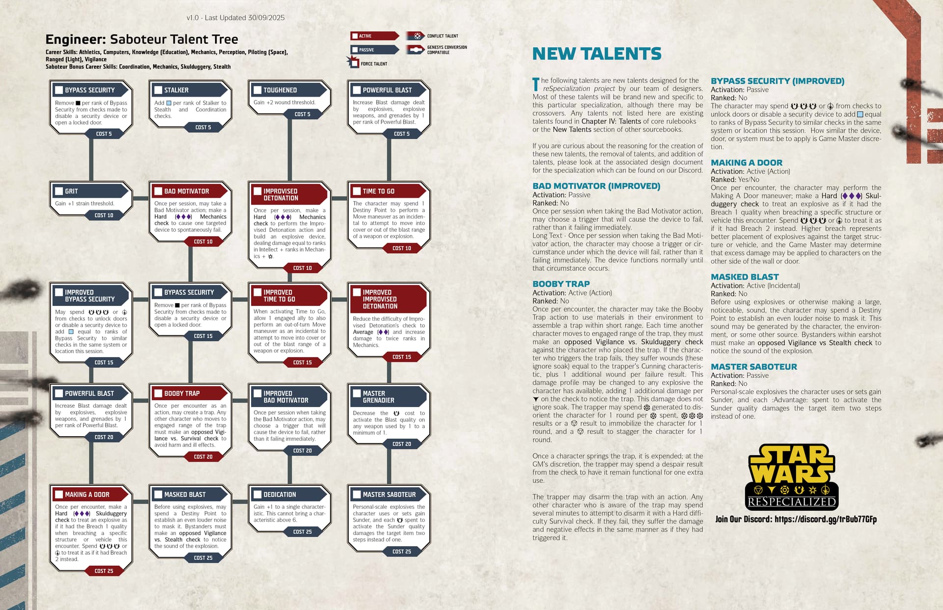 - Sapper and Saboteur received quality of life improvements, cutting a few less-attractive talents to shore up secondary niches, like counter-mobility and stealth / traps, respectively.