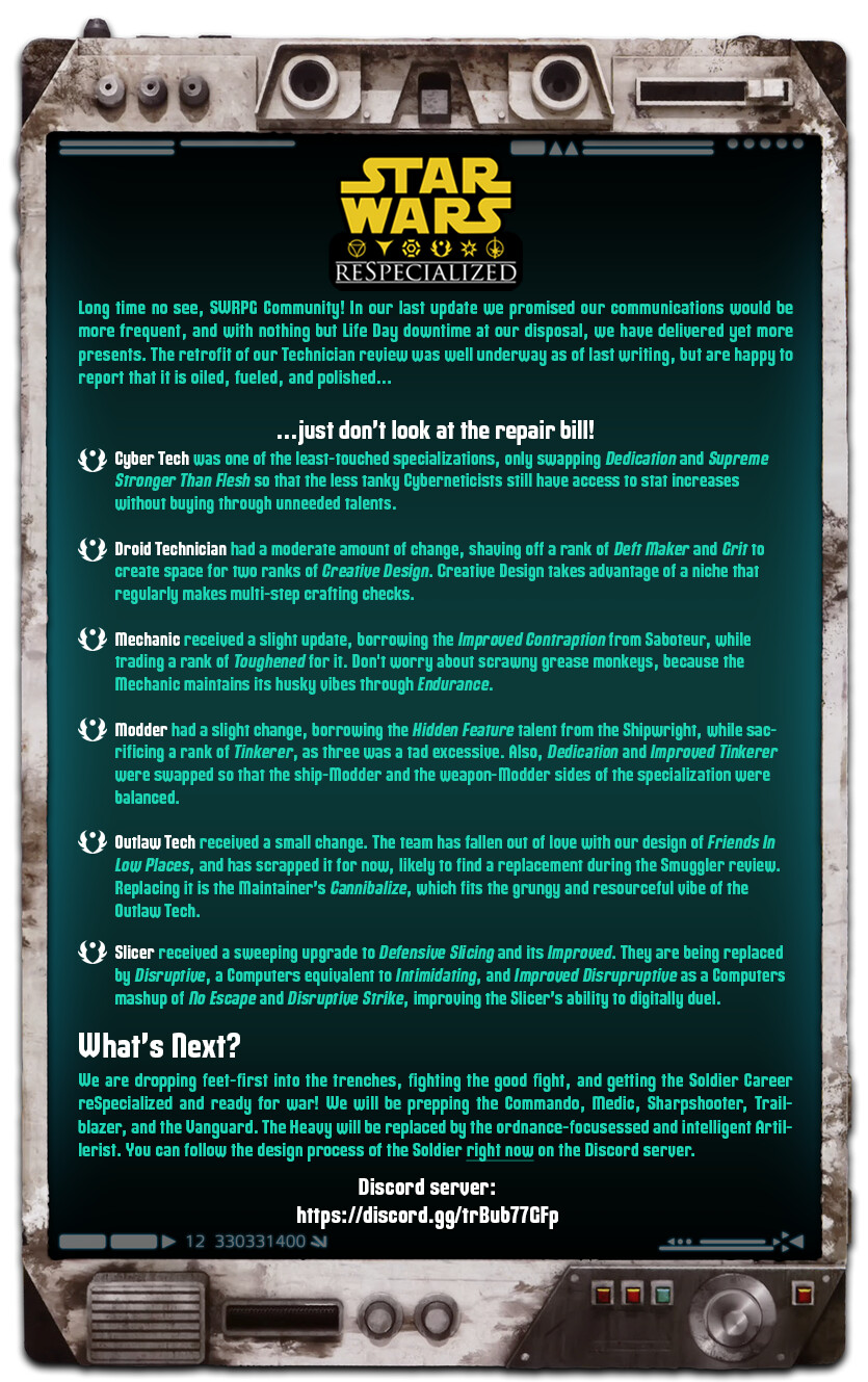 Last time you saw us, we had said we were going to take Life Day off and rest! Fortunately for you, rest to us looks a lot like Specialization updates and active development! So we are back with the newest release and our first MINOR UPDATE…