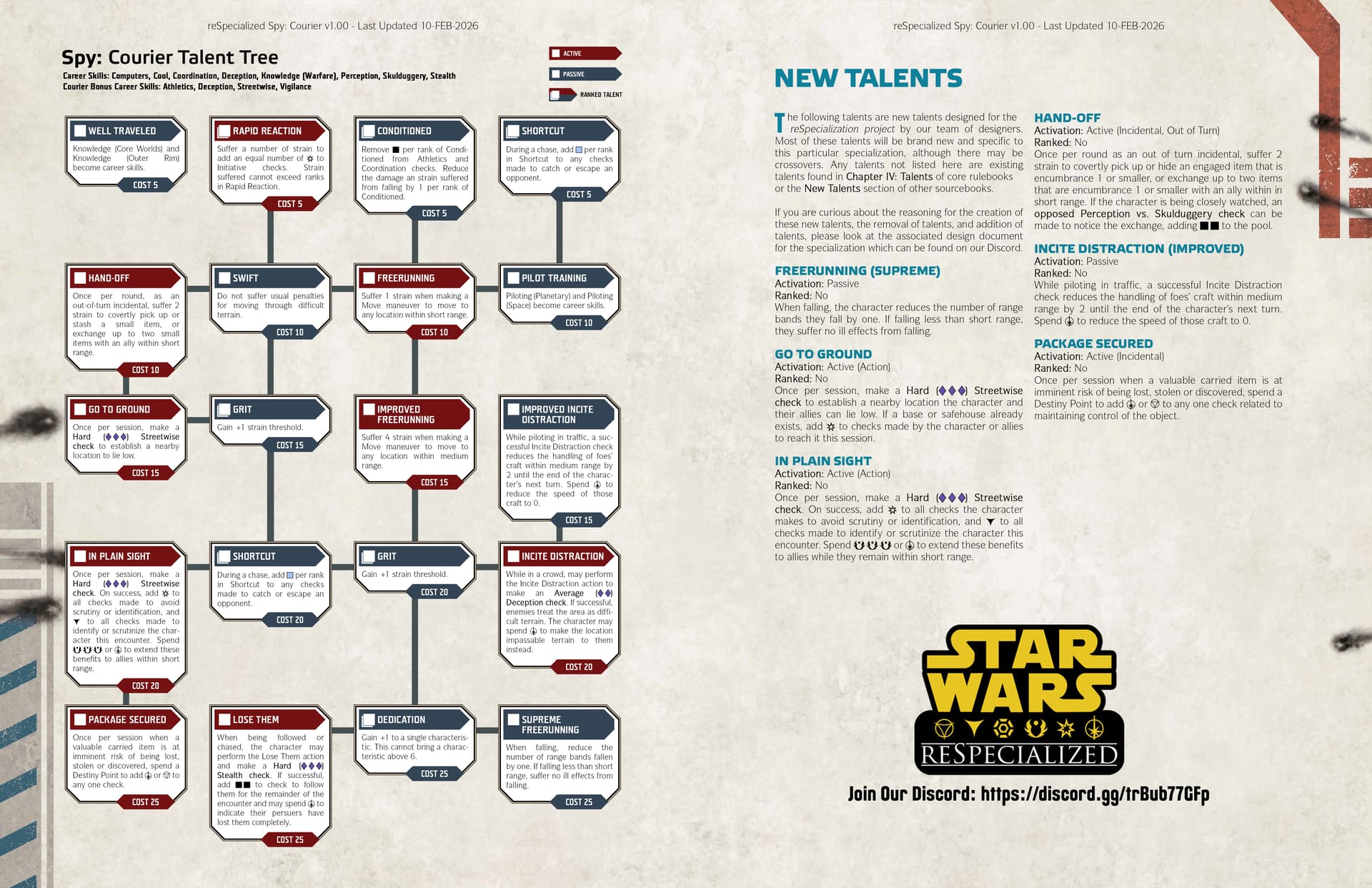 As usual, I will talk about my favorite spec we developed. Courier is one of my favorite specializations RAW, but it had so much “fat.” Cutting all the talents that were mostly filler gave us room for Vehicular options, Supreme Freerunning for anti-fall utility, and a ton of actual streetwise tools that help sell the fantasy for being both a Spy and a Courier.