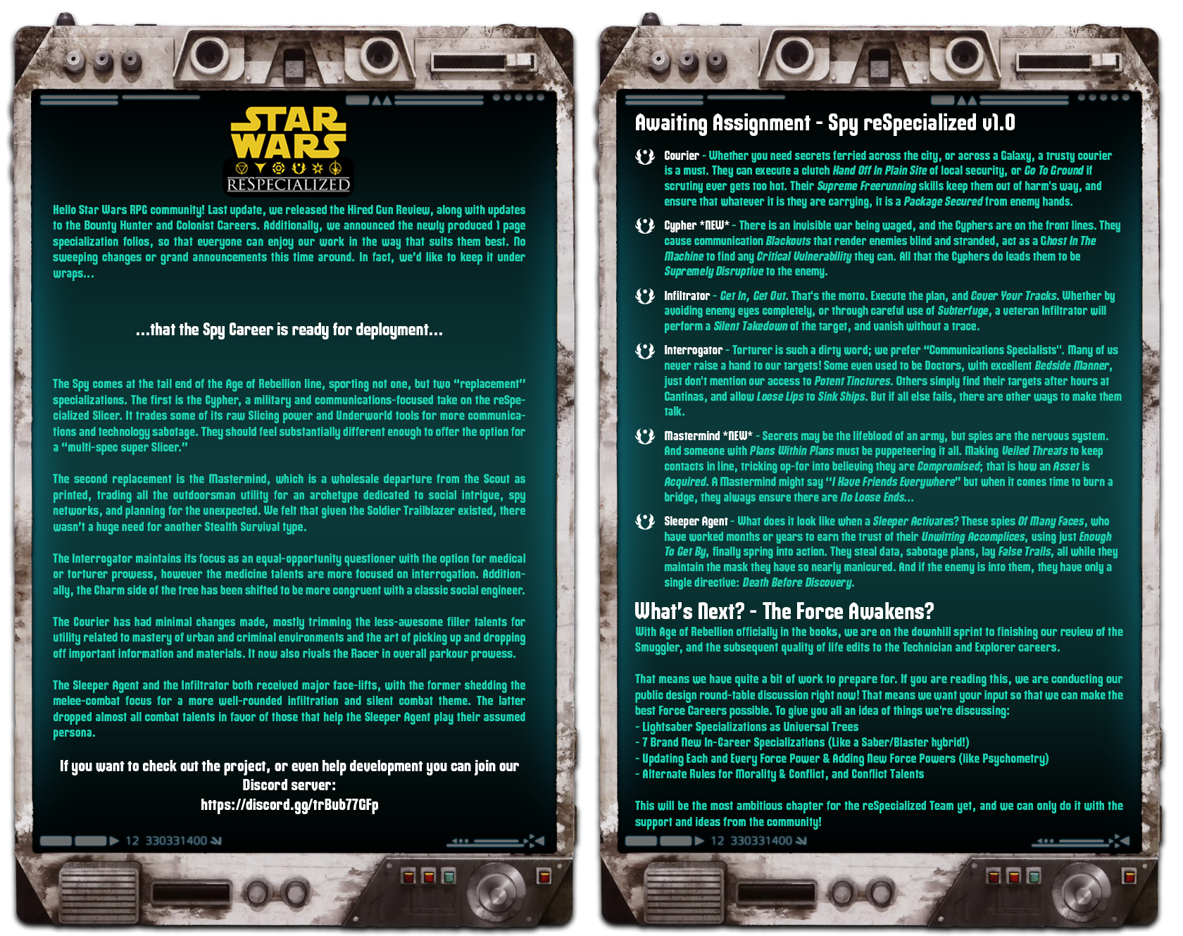 I do want to echo the final paragraph of the update folio above - We are in active and open development of the fundamental changes being made to Force And Destiny. There has already been so much in the open discussion we’re implementing in our broader plan to fix up the Force Powers and F&D Specs, but there is still so much that has yet to be discussed and decided! Please make yourself heard and join the process!