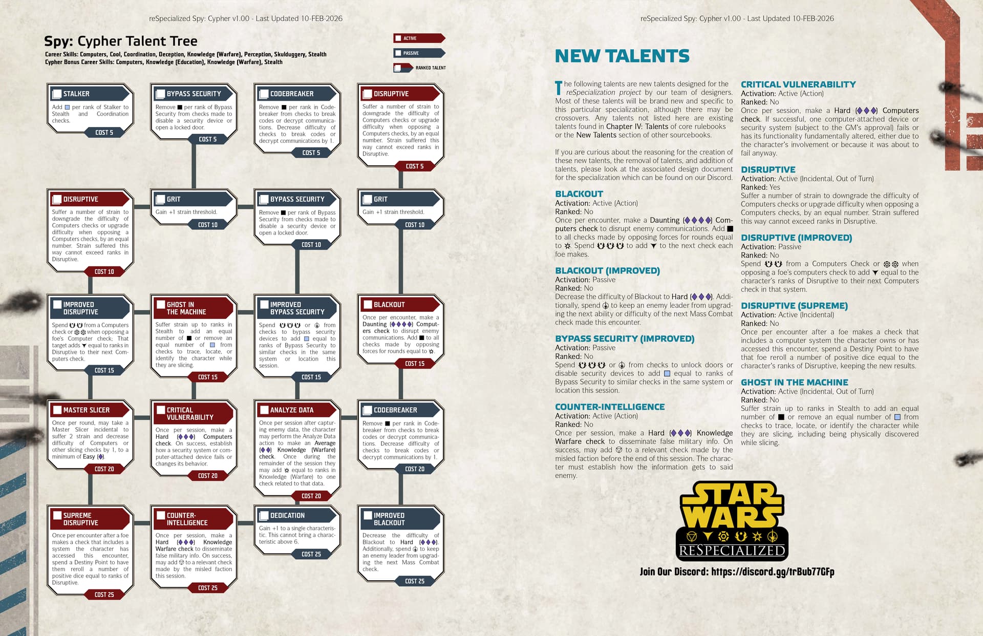 While the high-level design of Spy was difficult, as we initially pitched a number of design options for the replacement for the Scout, individual Specialization development flowed fairly well. After deciding on the Mastermind to replace it, heavily referencing Luthen Rael as a Mastermind of Rebel cells, the spec came together in record time. The Slicer to Cypher pipeline was much shorter, and we knew immediately how we wanted to handle the twist on the military slicer.